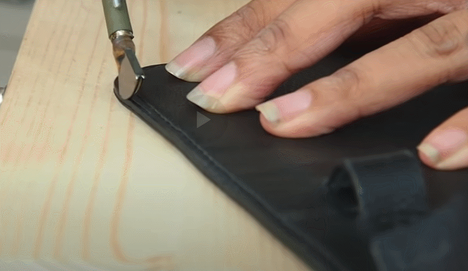 pushing the bottom of the L letter out of the leather buttonhole.